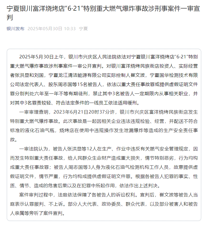 2025年5月30日上午,银川市兴庆区人民法院依法对宁夏银川富洋烧烤店“6·21”特别重大燃气爆炸事故涉刑事案件一审公开宣判。对银川富洋烧烤民族街店投资人、实际经营者张洪显和刘国,宁夏龙江清洁能源有限公司实际控制人崔文波,宁夏国华检测技术有限公司法定代表人、股东周志国等15名被告人,依法以重大责任事故罪或提供虚假证明文件罪分别判处六年至一年不等有期徒刑,禁止其中3名被告人一定期限内从事相关职业,并对其中3名罪责较轻、符合法定条件的一线员工依法适用缓刑。
